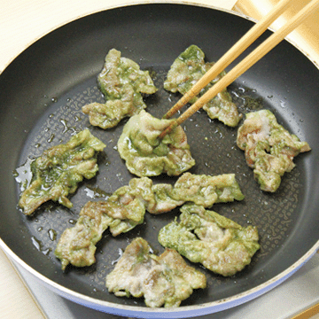 豚肉は塩・こしょうで下味をつけ、片栗粉、緑効青汁をまんべんなくまぶず。フライパンでごま油をひいて中火で熱し、豚肉を広げて入れ、両面を焼く。