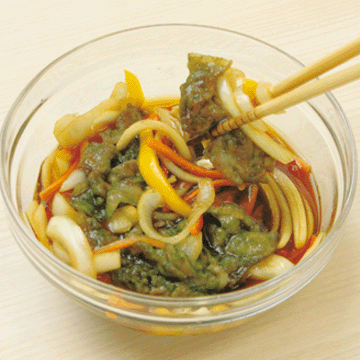 さっぱりとしたピリ辛な漬けタレが決め手!緑効青汁入りで栄養価もアップ! 野菜もお肉もたっぷり食べられるご飯がすすむ一品です。